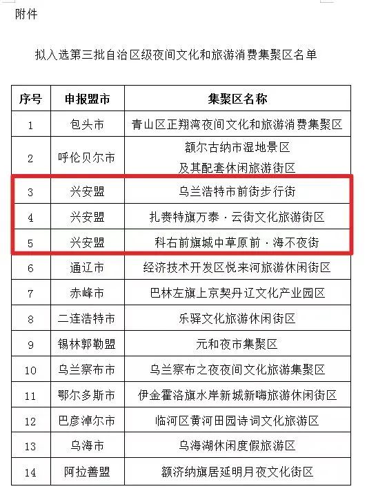 根据《内蒙古自治区文化和旅游厅关于开展第三批自治区级夜间文化和旅游消费集聚区申报工作的通知》,经旗县区人民政府申报,盟市文化和旅游局推荐,自治区文化和旅游厅评审,拟确定包头市青山区正翔湾夜间文化和旅游消费集聚区、呼伦贝尔市额尔古纳市湿地景区及其配套休闲旅游街区等14个集聚区为第三批自治区级夜间文化和旅游消费集聚区,现予以公示。