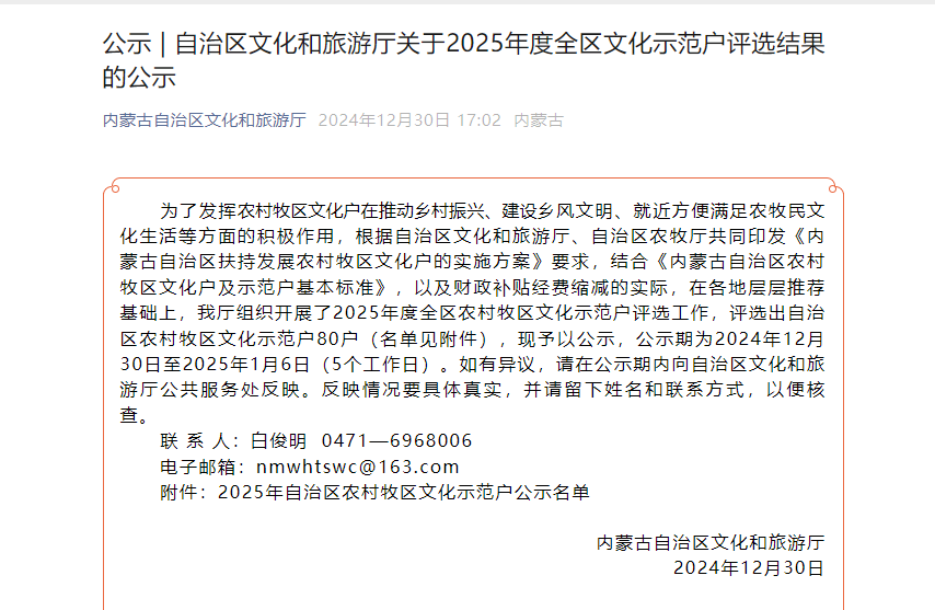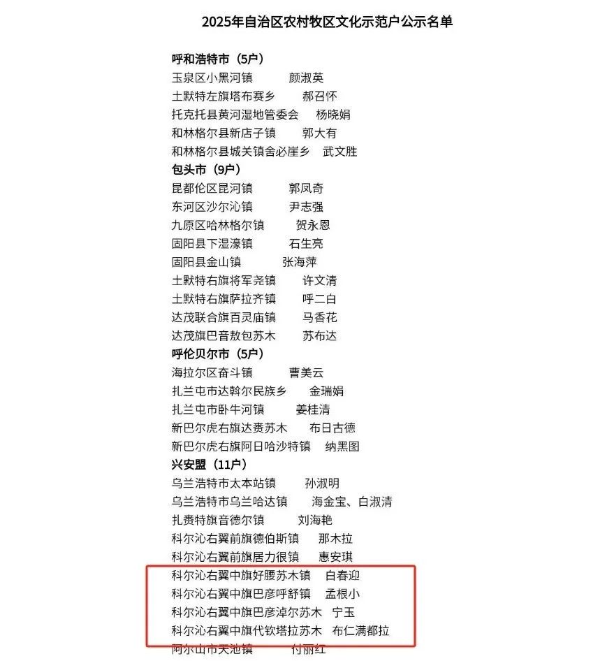近日,内蒙古自治区文化和旅游厅公布了2025年度全区文化示范户评选结果,其中科右中旗4个文化户入选,至此科右中旗自治区级农村牧区文化示范户增至28户。