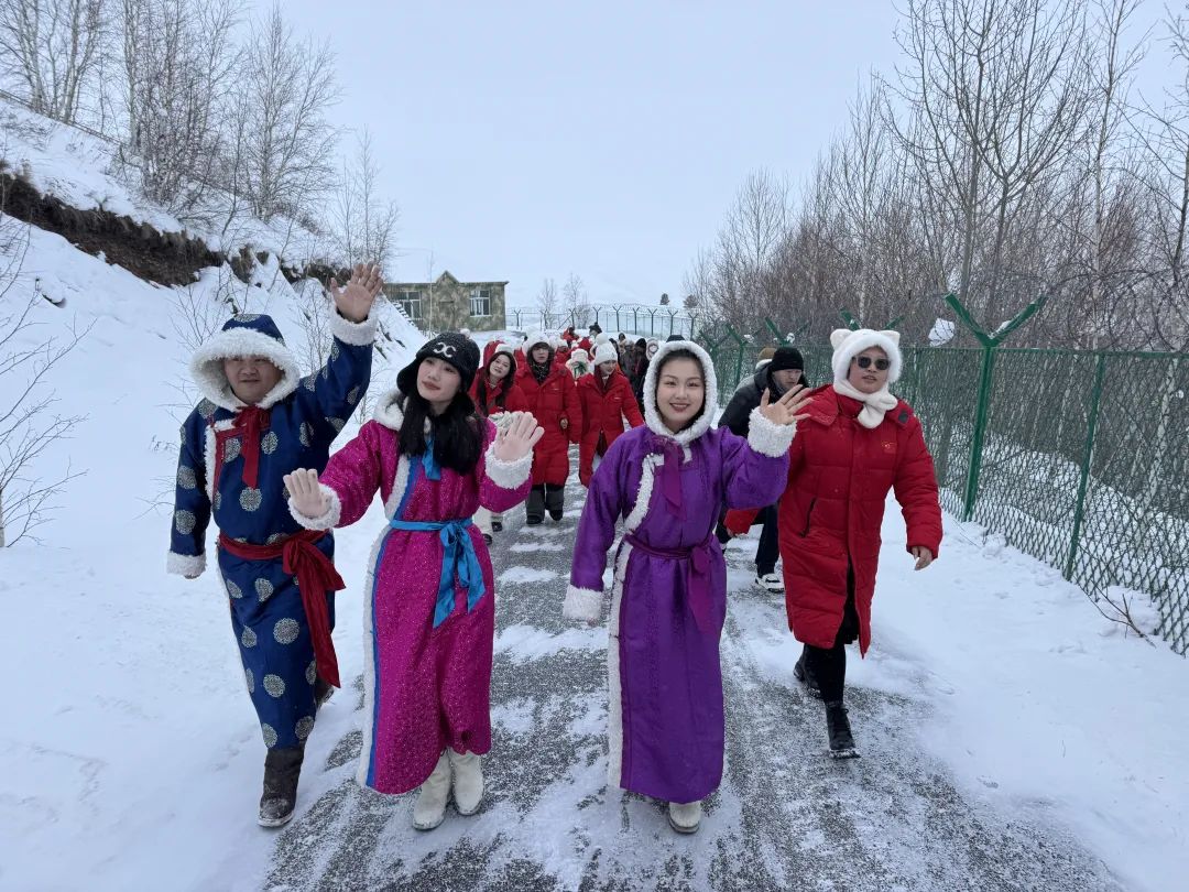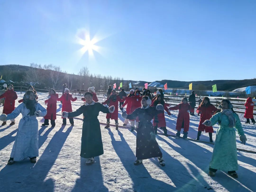 25日,乌兰牧骑队员和师生们在神奇不冻河、网红蓝房子探索自然美景,在雪村感受民俗文化,参与民俗表演,品尝特色美食,深入了解民族的风俗习惯和传统文化,切身感受和体验多彩的兴安盟。
