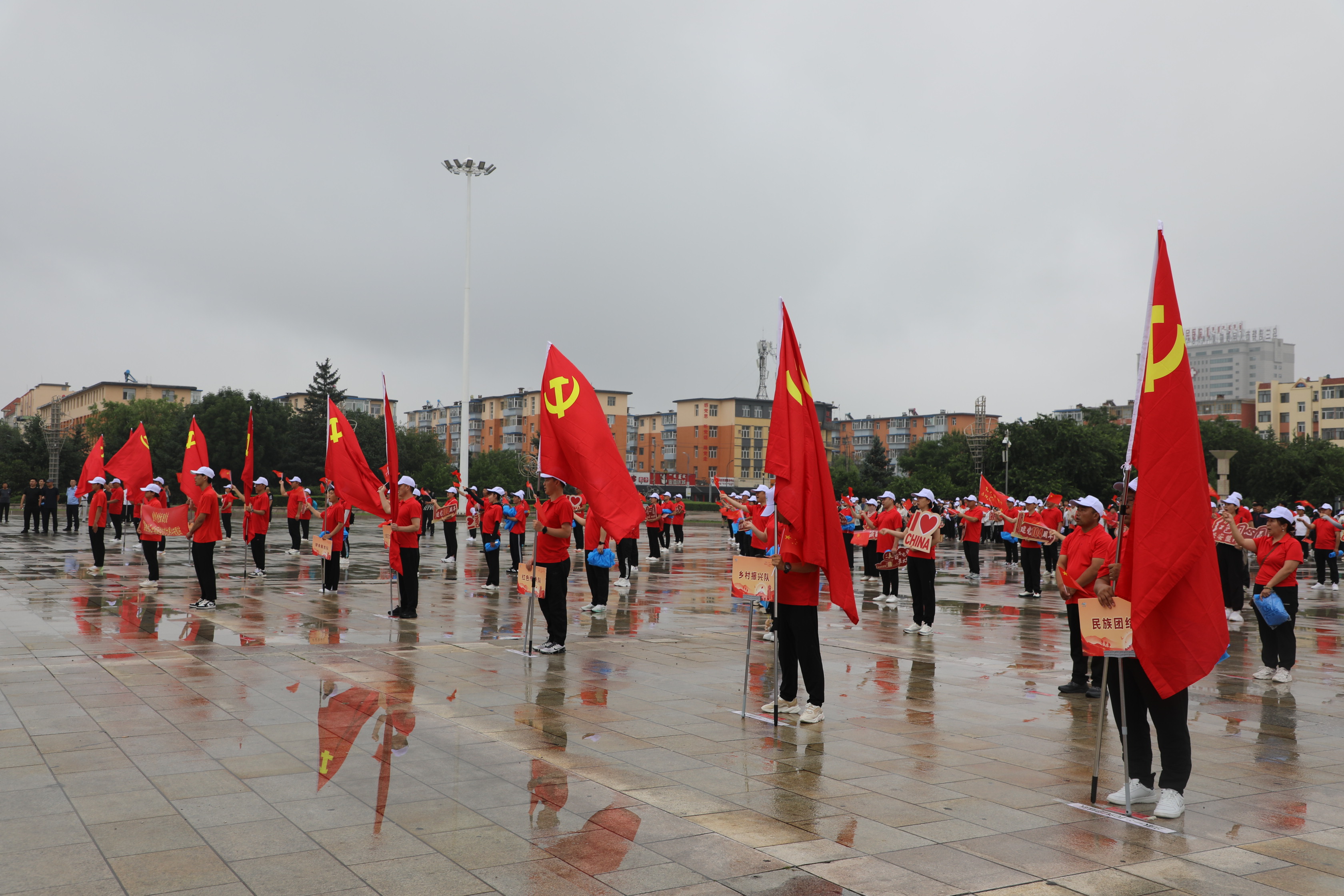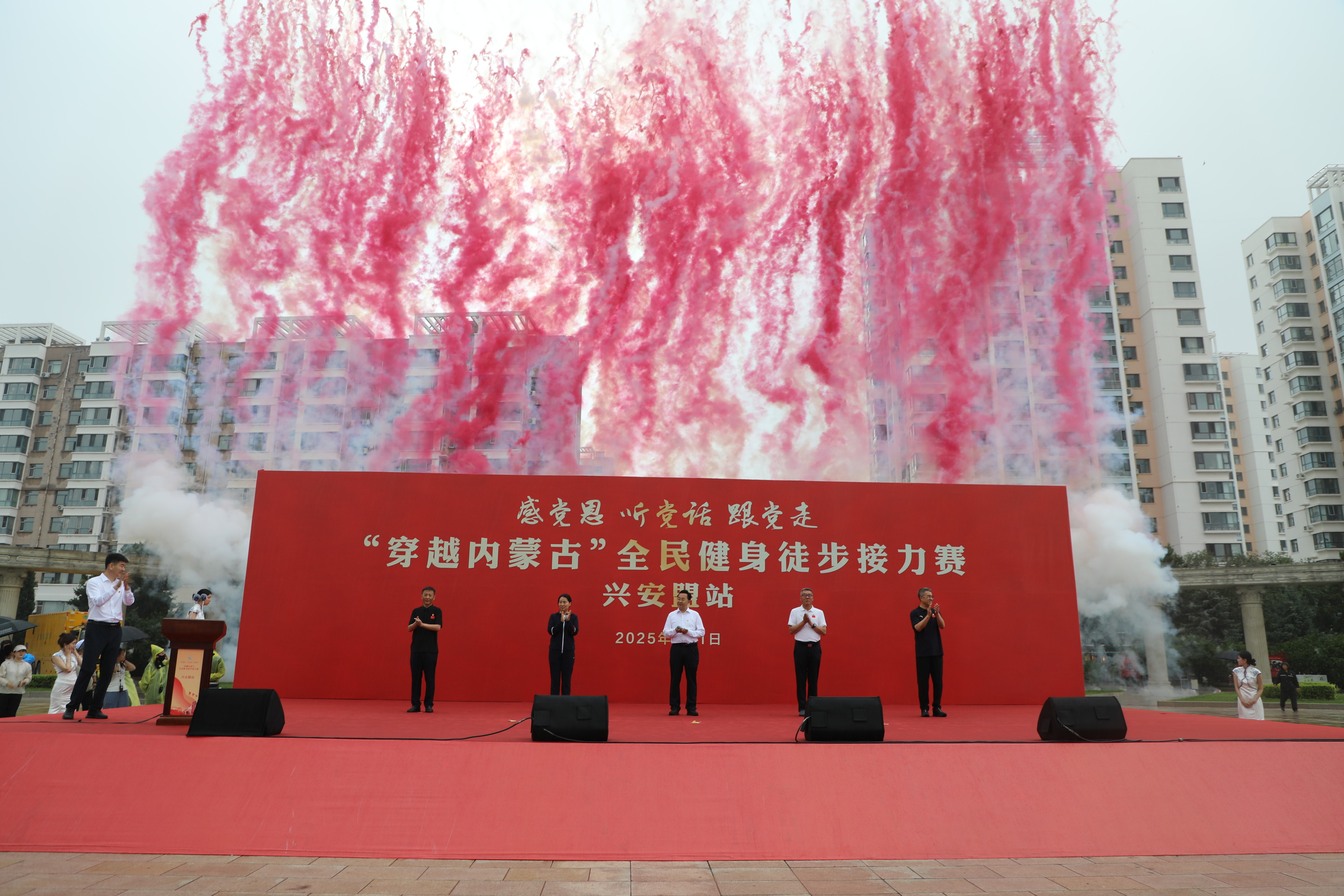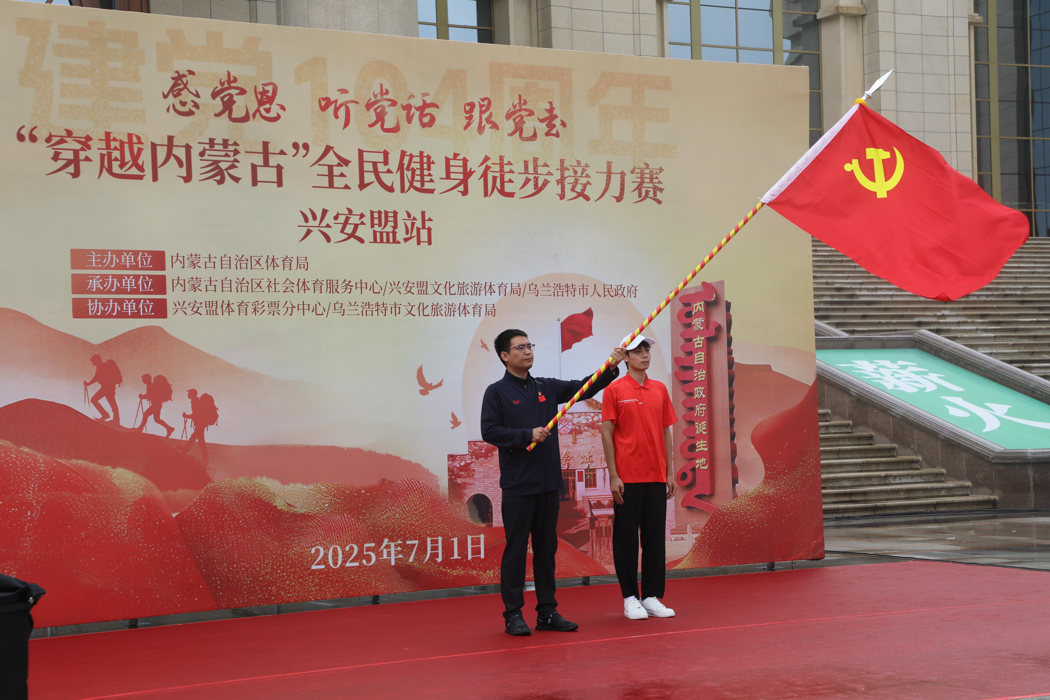 7月1日,在庆祝中国共产党成立104周年之际,由内蒙古自治区体育局主办,内蒙古自治区社会体育服务中心、兴安盟文化旅游体育局、乌兰浩特市人民政府承办的“感党恩、听党话、跟党走”穿越内蒙古全民健身徒步接力赛兴安盟站在乌兰浩特市五一广场拉开帷幕。兴安盟行署副盟长、科右前旗委书记孙书涛,内蒙古自治区社会体育服务中心主任郝占及盟市相关领导出席启动仪式。由104名社会各界优秀代表组成的10支徒步方队及3000余名干部群众参加活动。