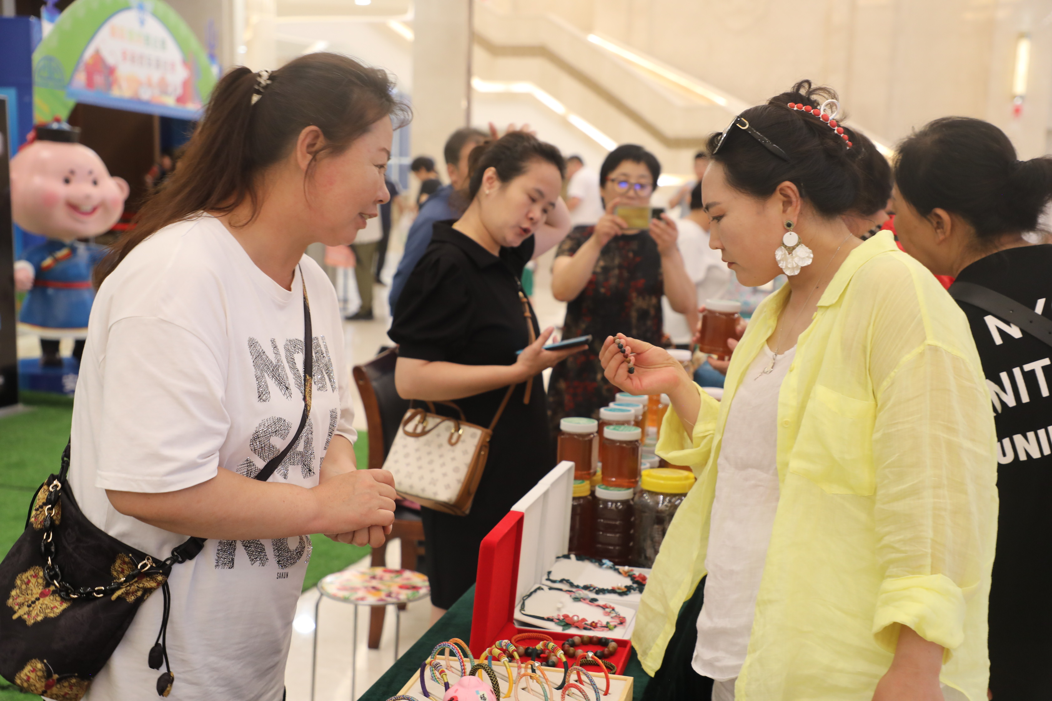 乌兰牧骑宫二楼大厅的非遗集市同样人气高涨,市民游客穿梭于摊位间,欣赏匠心非遗文创、品尝特色美食、选购心仪商品。集市每周六、日在二楼大厅开放,展销牛肉干、刺绣等上百种非遗及文创产品,带来全新消费体验。